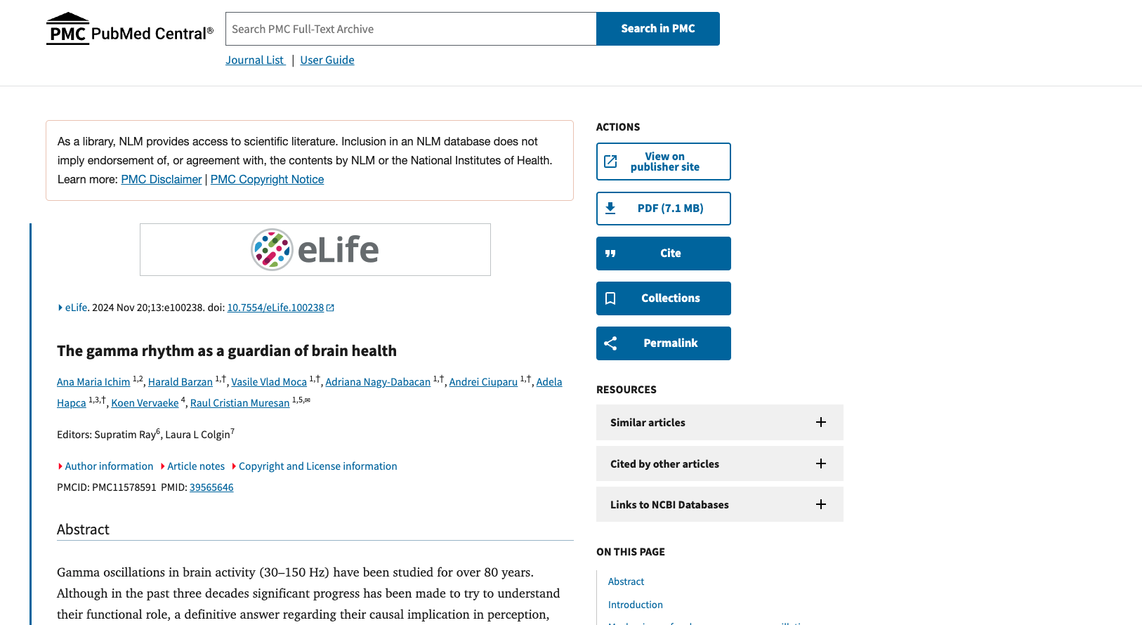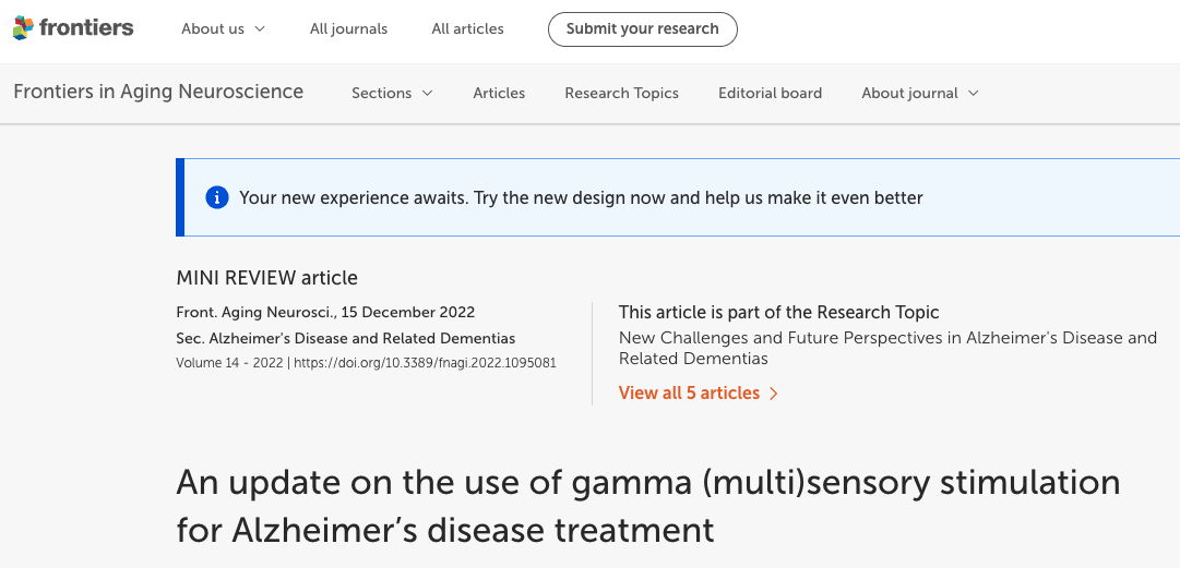 43. Chan, D., Suk, H.J., Jackson, B. L., Milman, N. P., Stark, D., Klerman,E. B., Kitchener, E., Fernandez Avalos, V. S., de Weck, G., Banerjee,A., Beach, S. D., Blanchard, J., Stearns, C., Boes, A. D., Vitermarkt,B., Gander, P., Howard, M., Sternberg, E.J., Nieto-Castanon, A., & Anteraper, S. (2022). Gamma frequency sensory stimulation in mild probable A********'s d******* patients: Results of feasibility and pilot studies. PLOS ONE, 17(12), e0278412., doi.org/10.1371/journal.pone.0278412